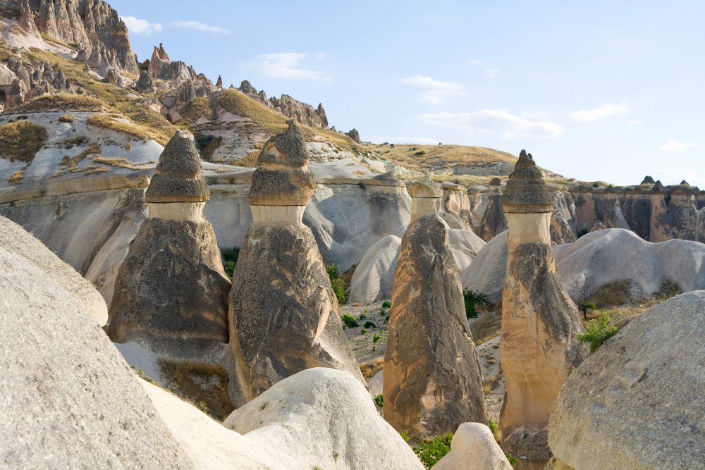 火山の噴火で柔らかい岩と固い岩が混ざり、柔らかい部分のみ浸食されてできたもの。キノコ形の岩は現地で「妖精の煙突」と呼ばれますが、本当に妖精や小人がひょっこり出てきそうですね。