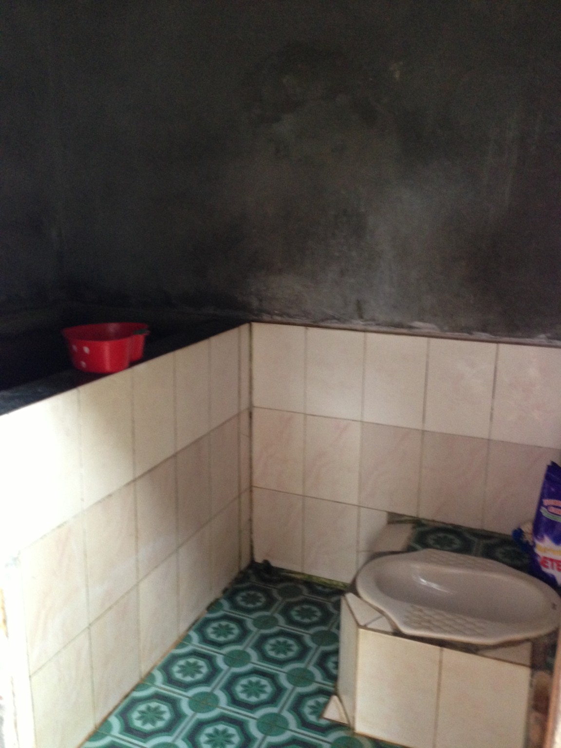 1番衝撃的だったのはトイレです。お手洗いは、ポツンと空いた穴と、その両横に足を置くスペースだけ。ここに足を置いて用を足し、終わったら横にある雨水を溜めてある大きな桶から水をすくって流します。