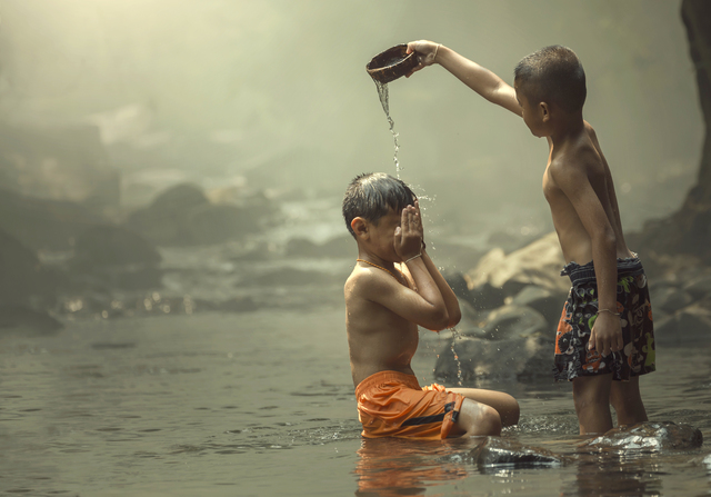 大きな浴槽のような所に溜めてある雨水で髪と身体を濡らし、持参したシャンプーや石鹸で洗い、また雨水で流します。温水ではないので、髪が長い人には少し大変かもしれないです。