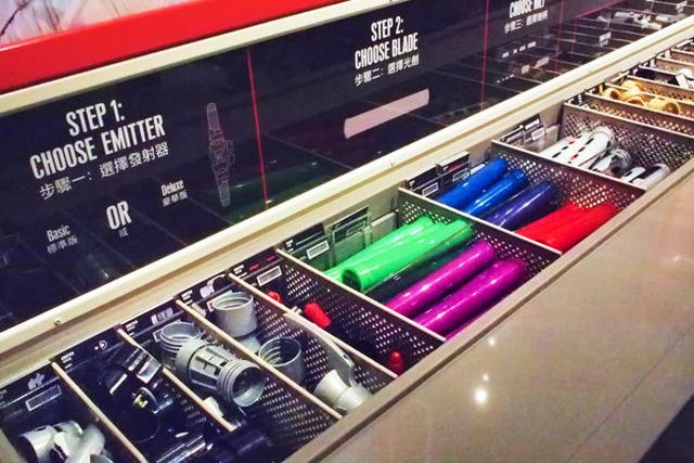 グッズショップのなかでも、一番注目したいのが、トゥモローランド内の「スター・ウォーズ サープラス」。こちらはスター・ウォーズ専門のグッズショップなのですが、なんと様々なパーツを選んでオリジナルのライトセーバーをD.I.Y.するコーナーが!自分で作ると気分はすっかりジェダイ・マスターです。