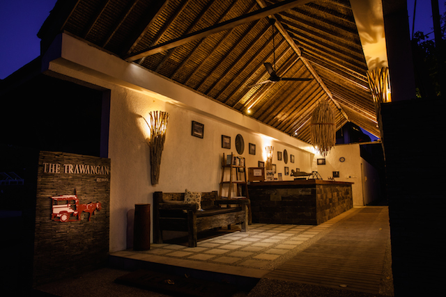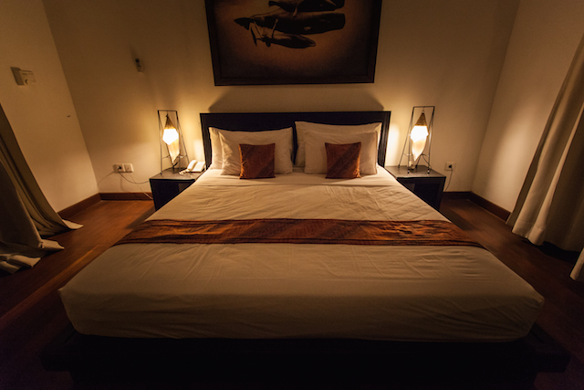リラックスナイト派の筆者は、中心部から離れた「THE TRAWANGAN RESORT」にステイすることに。二人で泊まっても充分な広さのベット。シャワーはアウトサイド、テラスも各部屋についています。