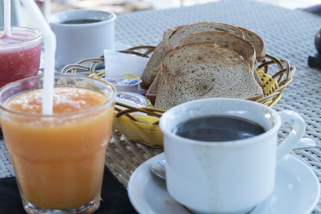 朝食はホテルのプライベートビーチにあるレストランでいただきます。フレッシュジュース、パン、メイン(数種類の中からひとつ選べる)、食後にコーヒーが用意されます。