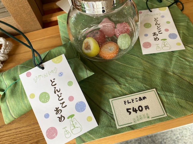ジブリの大倉庫からどんどこ森に向かう途中にある「どんどこ処」でも、お土産を販売しています。先ほど駄菓子屋で見つけた「極ふつうのラムネ 200円」はここでも購入OK。