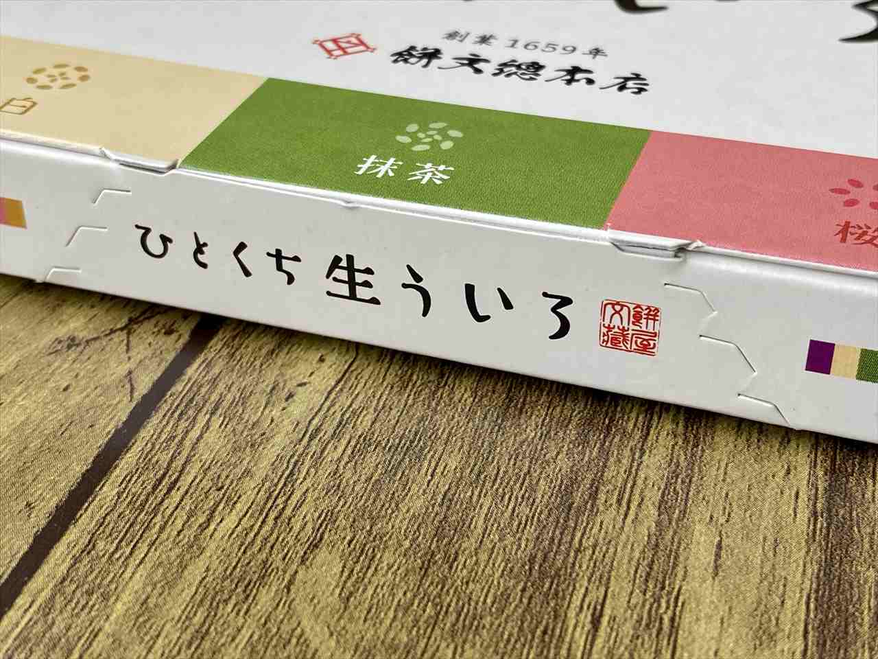 こちらは5個入の「ひとくち生ういろ」。白い背景に、「こしあん」、「白」、「抹茶」、「桜」、「きなこ」それぞれのカラーがあしらわれたシンプルなデザインです。