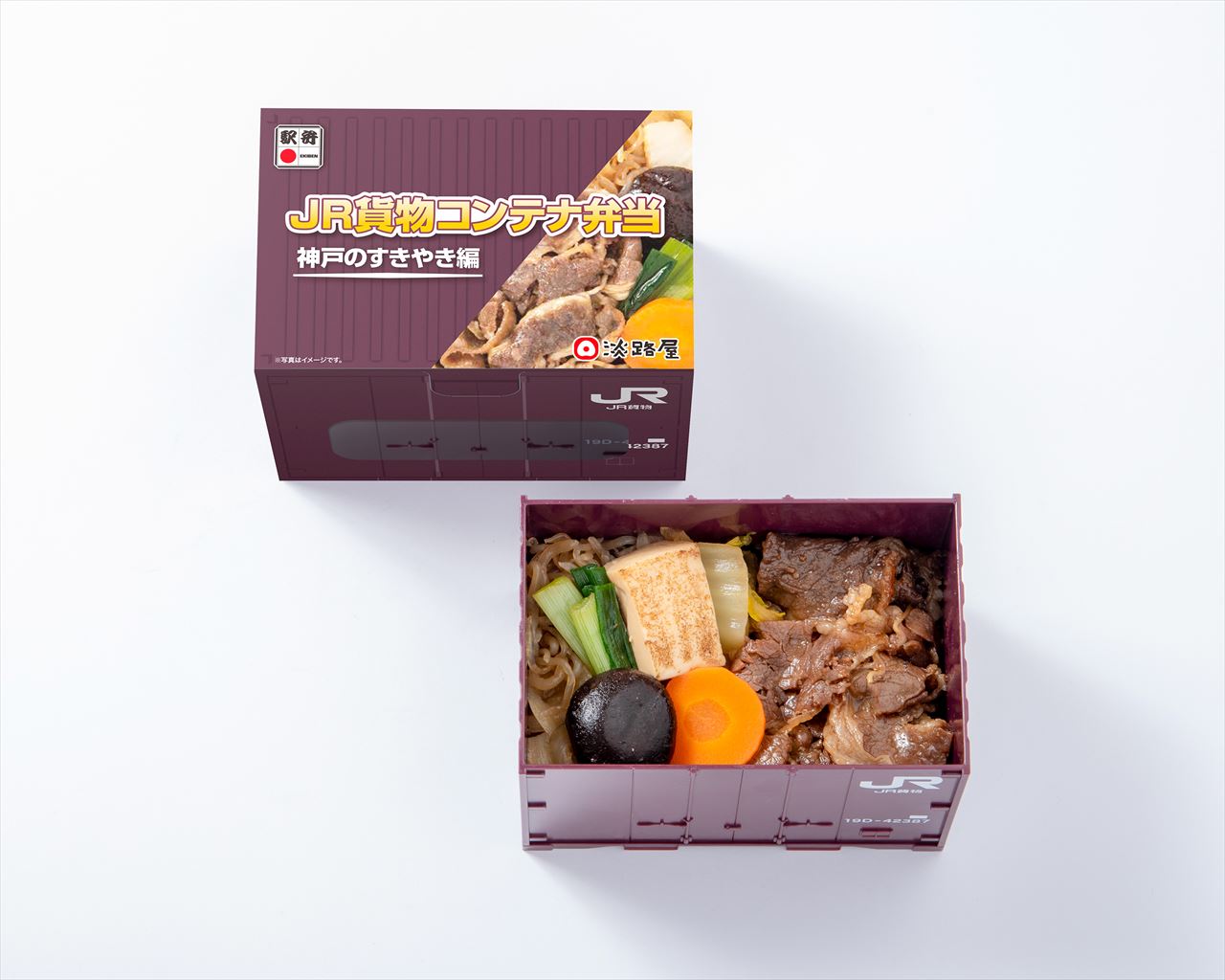 JR貨物コンテナをモチーフにした弁当箱が使われています。甘辛いすきやきをコンテナの中に盛り付けたお弁当。