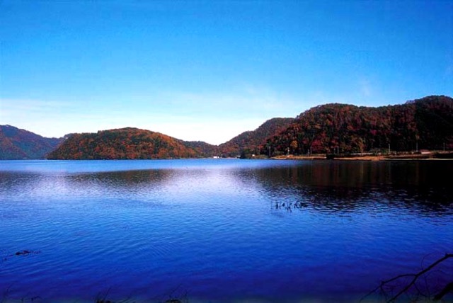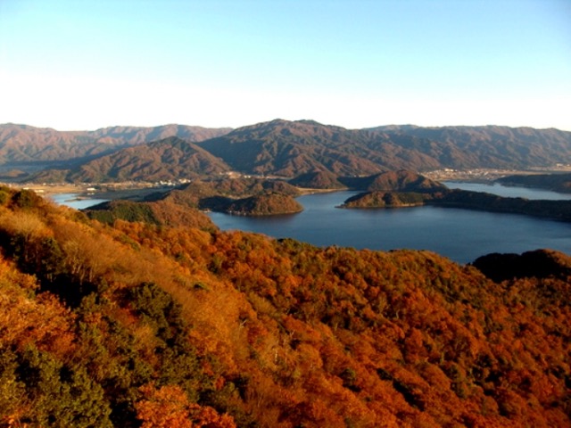 紅葉の時期(11月30日まで)は普通車の通行料1,040円が半額。湖畔の低山の紅葉を楽しみながら右に左にハンドルを切っていき、標高400mの梅丈岳の山頂展望台を目指してください。