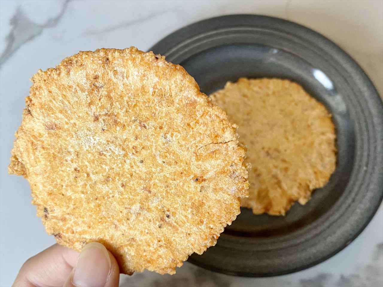 パッケージの裏面に「めんべいは、かたさが特徴の御菓子です。少しずつよく噛んでお召し上がりください。」と記載されている通り、かなりの歯ごたえ。パリッといい音がします。