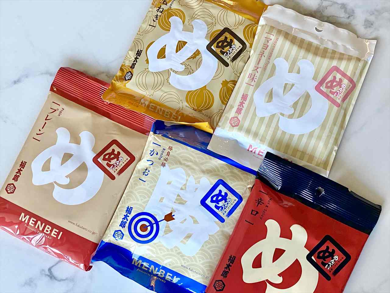 そんな「めんべい」のなかから、今回はプレーン、マヨネーズ、玉ねぎ、かつお、辛口の5種を食べ比べして紹介します。