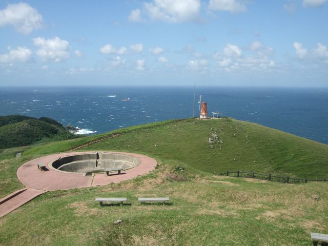 中津宮や沖津宮遙拝所がある「大島」(神湊港渡船ターミナルから船で約20分)には、絶景スポットがいっぱいあります。特に、景色が最高なのが「風車展望所」。晴れた日には、真っ青な玄界灘のパノラマビューを楽しむことができます。春は菜の花、夏はひまわり、秋にはコスモスと、シーズンごとに変わる風景も見どころです。