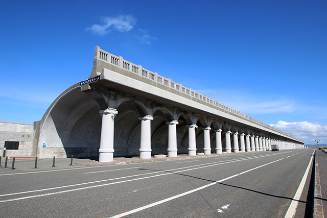 少し変わっているのが、堤防の外側から半ドーム状の重厚な庇が400m以上にわたって設置されていること。「稚内港北防波堤ドーム」と呼ばれるこの構造物は、海洋航路の発着点を北海の荒波から守るために建設された港湾施設の一部です。現在は土木学会選奨土木遺産、北海道遺産に指定されています。