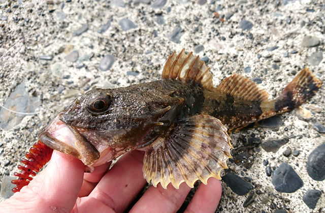 底まで落ちたところでルアーを上下させていると、「ゴツッ!」という手応えで何やら掛かりました。引きはさほど強くないので一気に巻き上げると、20cmほどの「シモフリカジカ」と思しき魚が釣れ上がりました。