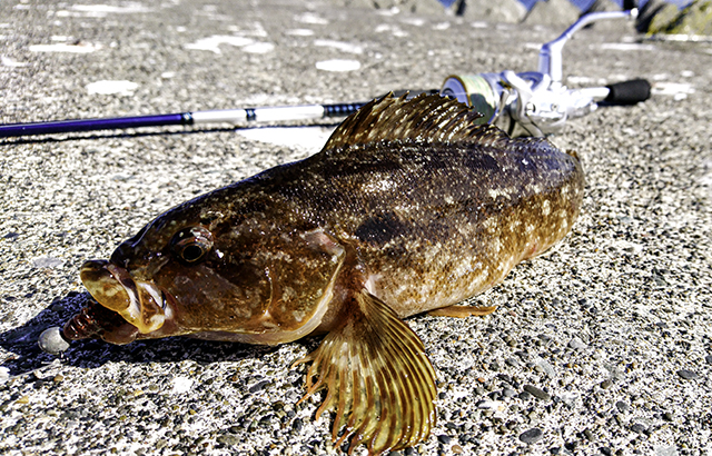 移動を繰り返しながらそんな一連を繰り返していると、いきなり竿先が「ギュン!」と引き絞られました。掛かっていたのは35cmほどの「アイナメ」。まだ中型ですが、観光ついでの釣りですから十分満足です。