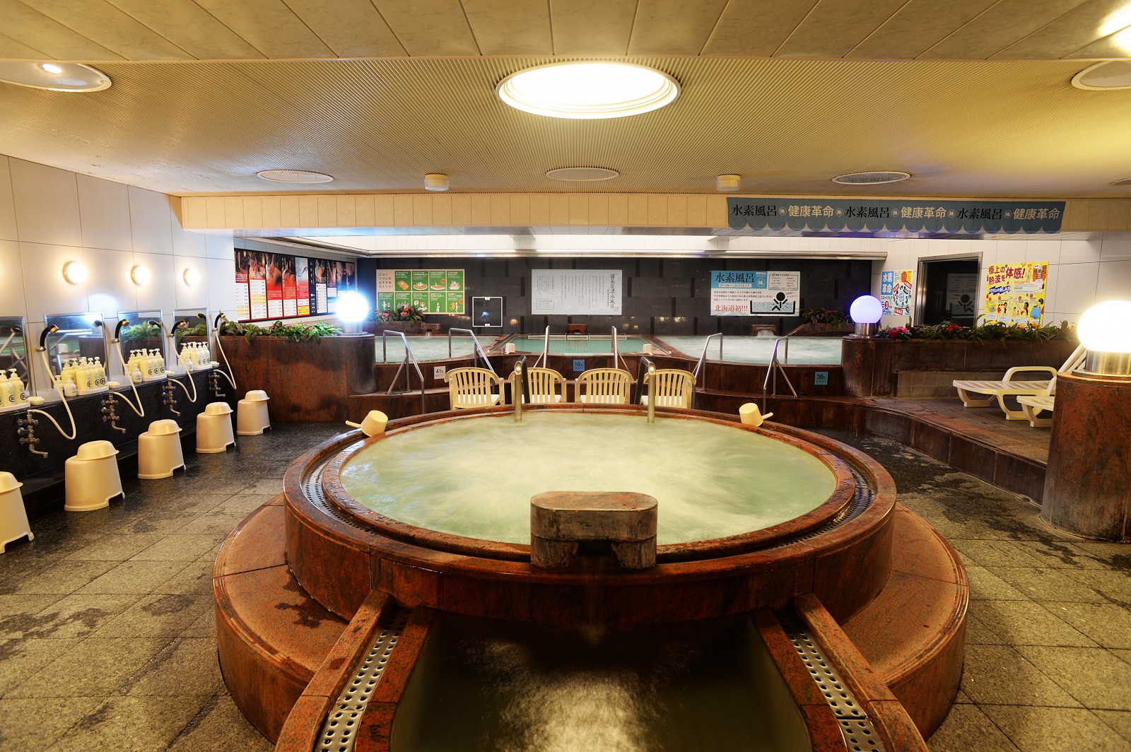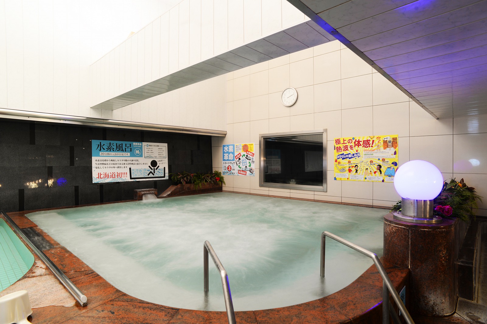 そんなニコーリフレの自慢のお風呂が、他の施設ではなかなか見かけることのない水素風呂です。それもそのはず、水素風呂は北海道初なのだそうで、これまでに100以上の温浴施設に訪れたことのある私も初めてお目にかかるちょっとレアなお風呂です。