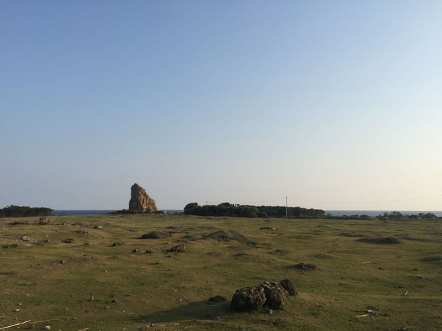 奥に見える巨大岩は、島のシンボル「赤立神」。島には大きな牧場があり、所々で牛と出会える。