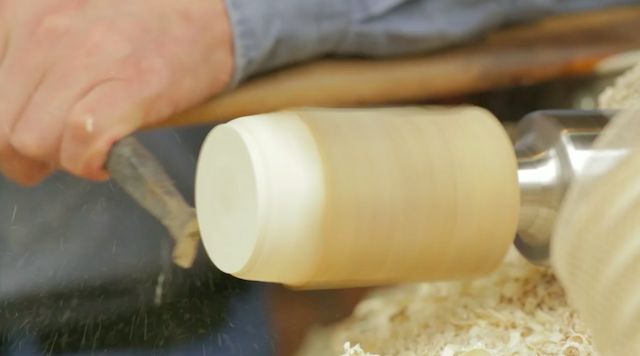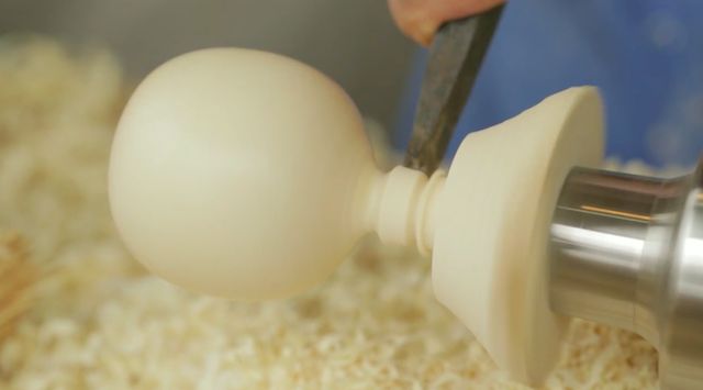 まず、こけしの寸法に切られた原木をろくろにかけて削り、頭を作っていきます。