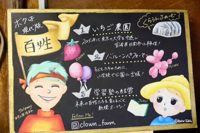 自分たちのことを「現代版 百姓」というたいぴー夫妻は、いちご農家とはちがう顔もたくさん持っています。皿回しやバルーンのパフォーマーとして学校や敬老会を回ったり、学習塾を経営していたり。「くらうんふぁーむ」という屋号も、道化師という意味と、いちごの起点となる王冠の意味と、両方が込められているそう。