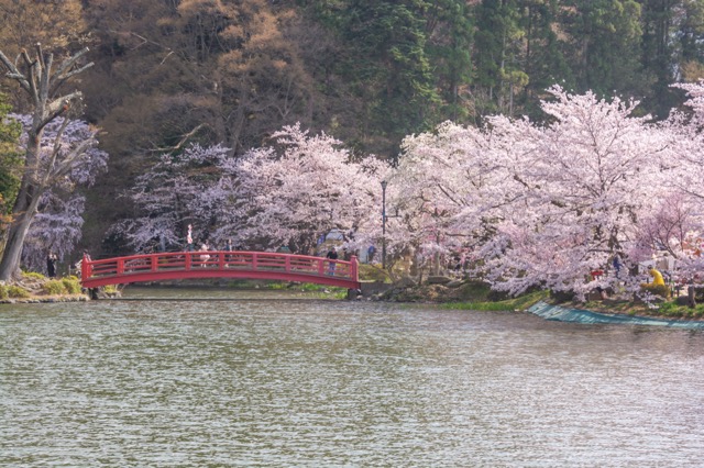 約600本の桜が楽しめるという臥竜公園。特に公園内の北東部にある周囲約800メートルの竜ヶ池の桜並木が有名で、「さくら名所100選」にも選ばれています。池の周りにはソメイヨシノを中心に160本の桜が植樹されているそうですよ。湖と桜の風景、湖に架かる赤い橋と桜など、湖周辺を中心に桜のスポットが点在しています。