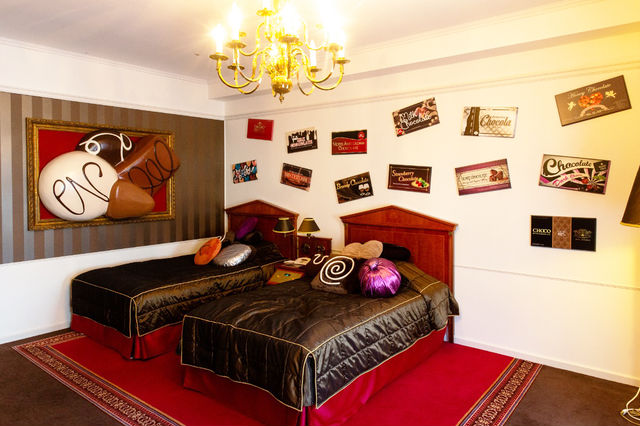 1日1組限定ではありますが「ホテルアムステルダム」には「チョコレートルーム」なるものがあります。壁の立体チョコレートに、チョコレート枕、アメニティにもチョコレートフレーバーのものが用意され、鼻血が出ないか心配になるレベル。