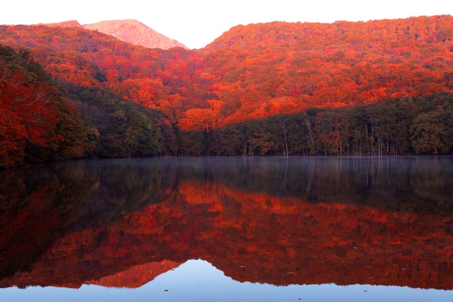 八甲田山の麓、十和田八幡平国立公園にある蔦沼。真っ赤な紅葉の水鏡は、朝焼けによって森が赤いベールをかけられるもの。奇跡の赤い瞬間を求めて、多くのカメラマンが集まります。