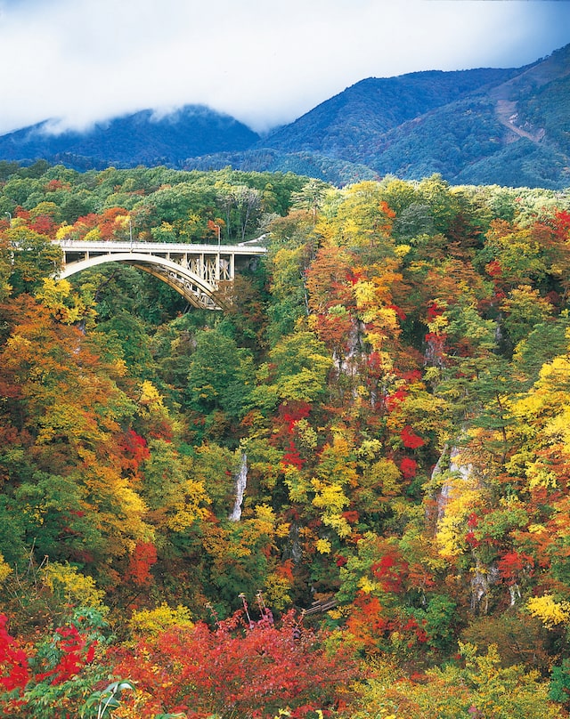 色鮮やかな鳴子峡とアーチを描く大深沢橋