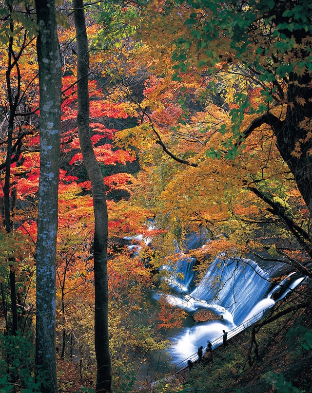 階段のように2段になって流れる「滑津大滝」は別名「二階滝」とも呼ばれ、高さ約10m、幅約30m、水量の多いことで知られる名瀑。滝に沿うように遊歩道が整備されているので、迫力のある滝を楽しみながらブナ、ナラ、カエデに染まる森を散策できますよ。