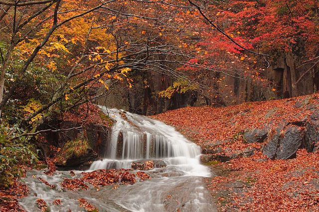 皆瀬川の急流が、両岸を深く浸食して出来たV字の小安峡谷。98℃の温泉と蒸気が音を立てて噴出している珍しい峡谷は、大噴湯や大小の滝があり、ブナ、イタヤカエデ、モミジが華やかに紅葉。旅の疲れは、小安峡温泉で癒やして帰りましょう。