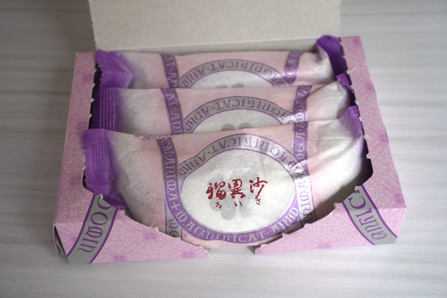 箱の中には3個のお菓子が入っています。こちらは302円(税込)とお手頃価格。お土産をたくさん買わなくてはならないときにありがたいですよね。サイズはほかにもあるので、シーンに合わせて選びましょう!