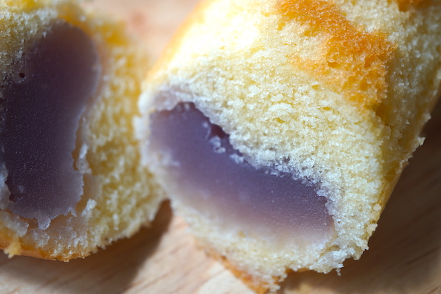 中にはうっすらすみれ色の餡が入っていました。しっとりとしたカステラはバター風味。バイオレットリキュールで香りをつけたという餡は優しい味です。リキュールの味は、あまり感じませんでした。