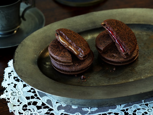 しっとりと焼き上げたココアクッキーをミルクチョコレートでコーティングして、2種類のソースをサンド。爽やかな酸味のストロベリーソースと、濃厚なヘーゼルナッツクリームの2つの味のショコラサンドが楽しめるアソートです。