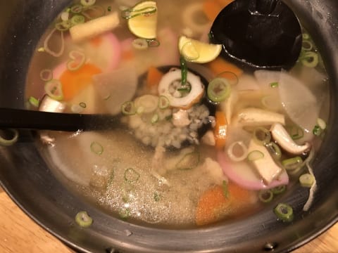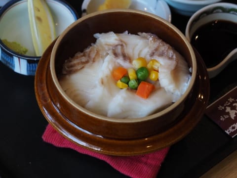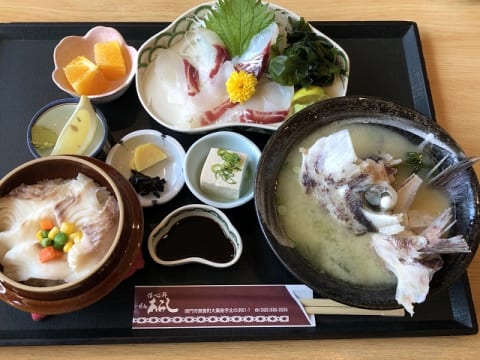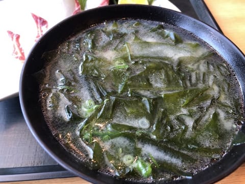 一緒にいただく「わかめ汁」も、鳴門ならではの名物お味噌汁。普通いただく5倍くらいの量のワカメがぎっしりです。こちらもまた、激しい潮の流れの中で育つせいか、肉厚なワカメで食べ応え十分。濃厚でクリーミー、しっかり魚の出汁がきいたお味噌汁でした。