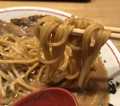 ベースはトンコツ醤油スープ。こってり濃いめのスープで、中細のストレート麺がよくスープに絡んでいます。