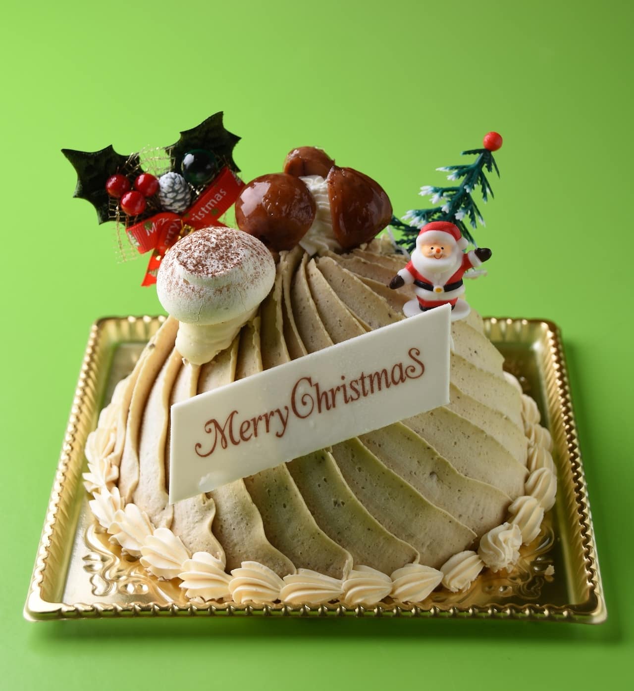 「お抹茶ツリーモンブラン」は、西尾の抹茶を使用した抹茶クリームをツリーに見立て、食感と抹茶を引き立たせる香ばしい飴掛けアーモンドをトッピング。赤いフリーズドライストロベリーと星形チョコレートを飾っています。