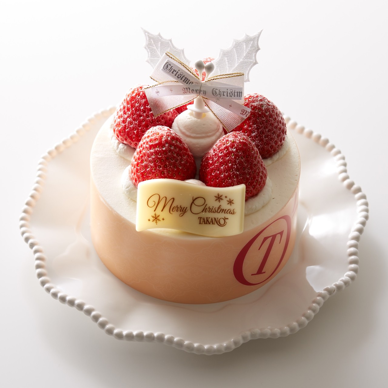 新宿高野の新作クリスマスケーキ。いちごのムースとフィリングをスポンジでサンドしています。老舗果物専門店ならではの、フレッシュないちごの魅力を引き出した可愛いケーキです。