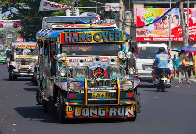 【庶民の足、ジプニー】チャレンジしてみたい乗合バス運賃は約8ペソ(約19円)と激安。おおよその行き先はバス側面に書かれており、どこでも乗り降りできます。降りるときは「停めて!」と叫ぶか、天井を叩いて合図。くれぐれもスリに注意。