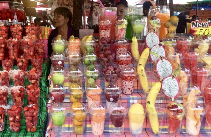 美味しそうなフルーツジュースのお店。でもタイへ来てから毎日のようにスムージー飲んでいるからたまには違う物にしよう。
