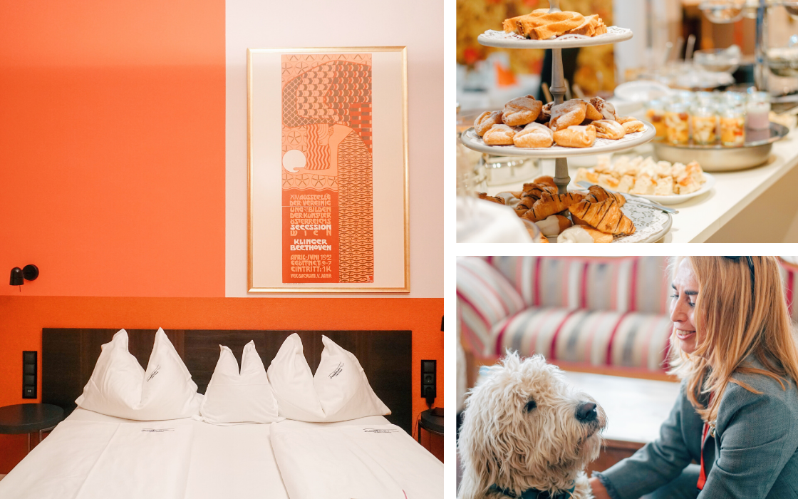 ホテルは各フロアごとに「強い女性」「ウィーンと愛」などテーマが設けられており、わたしが宿泊した2階のテーマは偶然にも、クリムトの傑作「ベートーヴェン・フリーズ」が展示されている「セセッション」だったのです!(セセッションとは、クリムトらが立ち上げたウィーン分離派の展示会館)