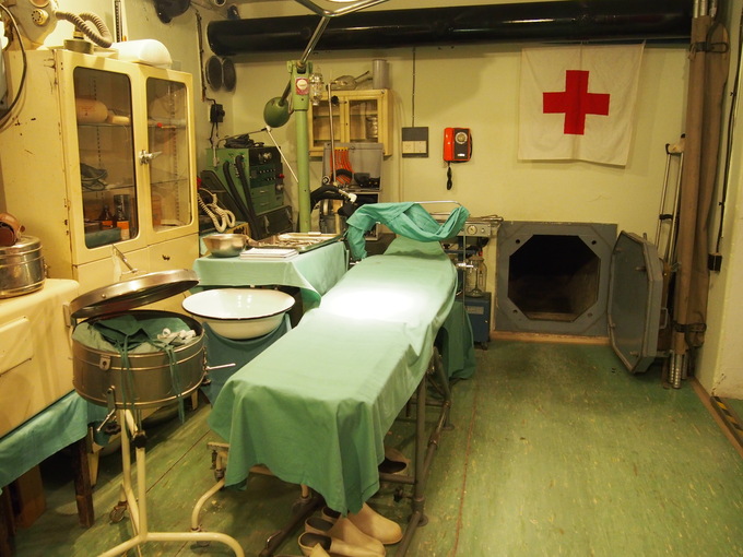分厚い扉を開くと、天井の低い地下空間が広がります。このシェルターは150名も収容できるとのこと。最初に案内された部屋は医務室です。ここで注目して欲しいのが写真右側にある穴です。
