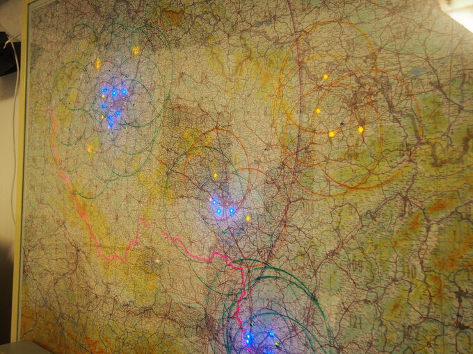 こちらはチェコスロバキアの地図です。赤線はオーストリアとの国境線、つまり自由主義陣営と共産主義陣営の境界線です。青点や黄点は地対空ミサイルなどが実戦配備されていた地点を表しています。半円はミサイルなどの兵器が届く範囲を示しています。