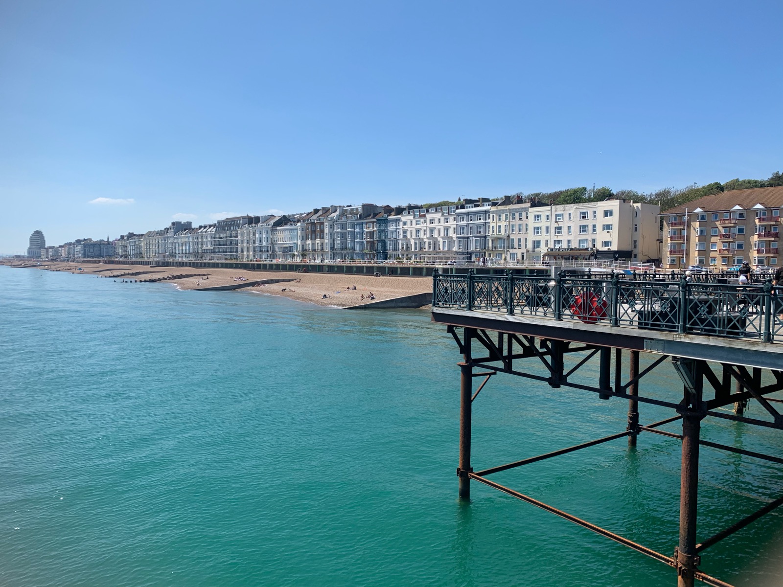 ヘイスティングスピアからは、エメラルドグリーンの美しい海はもちろん、海岸沿いにずらっと立ち並ぶカラフルなホテルを眺めることができ、のんびりと非日常の空間を堪能することができます。