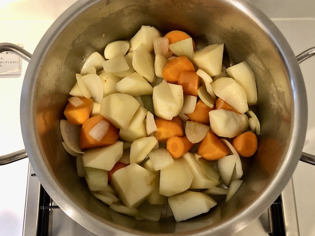 水(200ml)とコンソメを入れて、じゃがいもが柔らかくなるまで煮込みます。