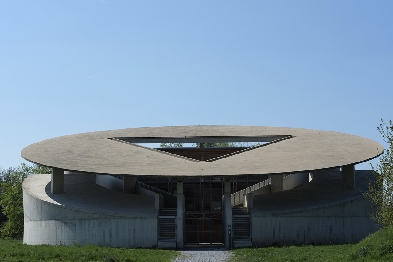 まずは、インセルホンブロイヒの顔となる建築がこちらの「Turm(塔)」。ミュージアムの入り口からゆるいくだり坂を下っていくと、最初に見えてくる塔は「石・ガラス・光」とこの3つをコンセプトとして建てられました。