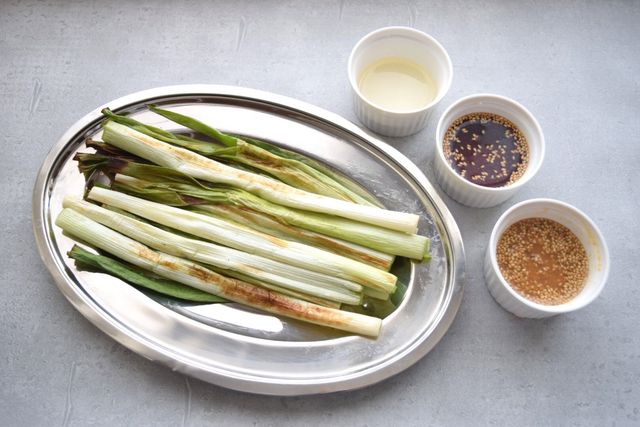 洗ったネギを15センチほどの長さに切ります。3〜4人分で5本くらいが目安。ネギにごま油を塗り、あとはトースターで焦げ目がつくまで焼いて、お皿に盛り付けるだけ。