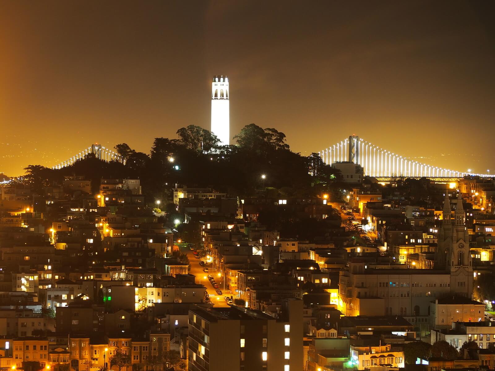 サンフランシスコを一望できるテレグラフヒルの丘に建てられた塔。歩いて行くには体力が必要なので市内を走るケーブルカーで行くのをオススメします。