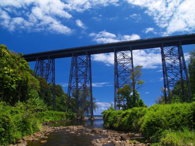 ワイメアから19号線をヒロに向かって走っていくと、右手に現れる巨大な橋。現在はハイウェイとして車が通っているが、かつてはサトウキビ列車が走っていた。橋のたもとにまでジャングルの熱帯植物が生い茂る様子は、ここが自然と共存してきた長い年月を感じさせる。
