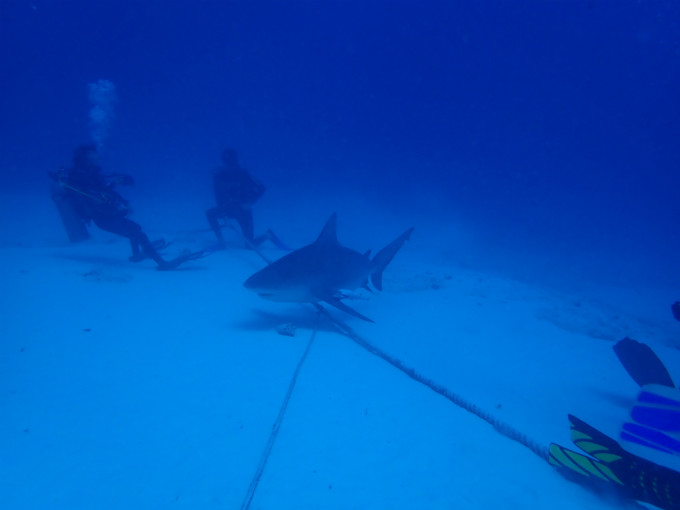 プラヤデルカルメンはカリブ海に面しており、港からボートでたった5分の所にブルシャークが集まるポイントがあります。浅場にはブルシャークはおらず、水底約30mの砂地を泳いでいます。