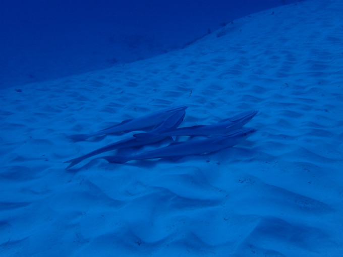 また砂地にはたくさんのコバンザメが待機しています。コバンザメは大きな生物に頭の吸盤でくっついて、おこぼれをもらう魚で、ブルシャークやエイが来てくれるのを砂地で待っています。