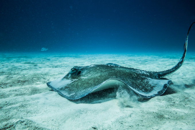 またブルシャークダイビングで遭遇できるのは、ブルシャークだけではありません。ポイントが完全な砂地な為、他の生物は非常に少ないですが稀に上記の様な3m級の巨大エイに遭遇できます。