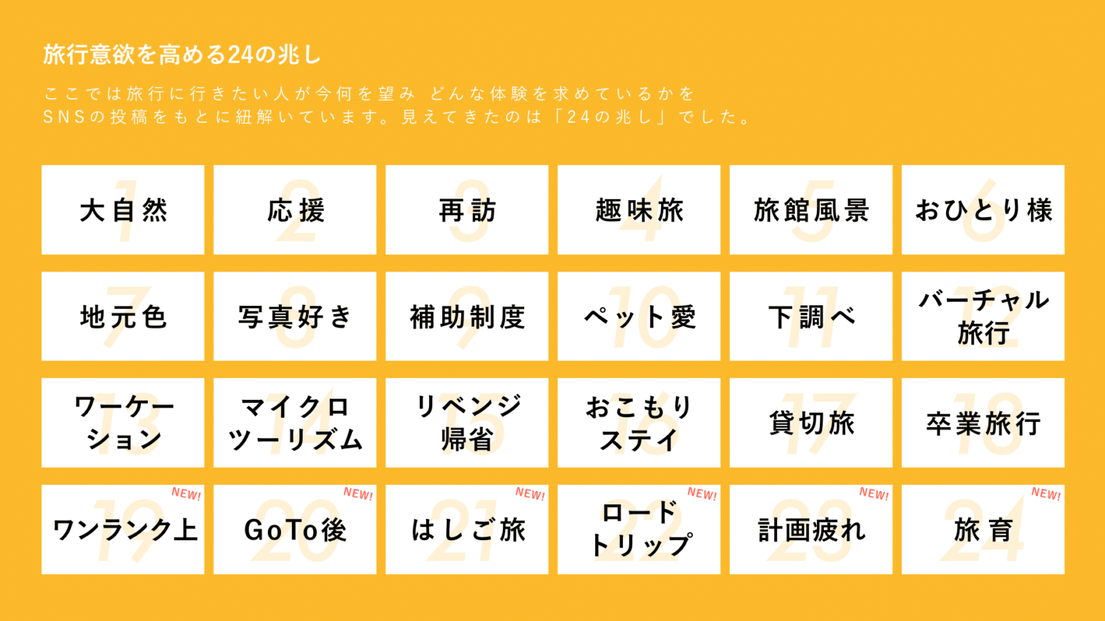 いまSNS上で生活者の声を分析すると、生活者が旅行をどう捉えて、何を求めているかの兆しが見えてきます。それは、観光業のみなさまが旅行企画を考えるためのヒントとなります。そんなヒントと企画の立て方をまとめたものです。