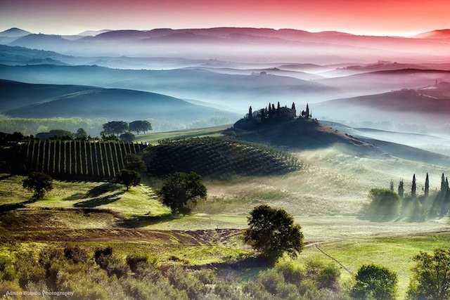 イタリア・フィレンツェにあり、数多くの映画でロケ地にも使用された風光明媚な「トスカーナの丘」。まるで童話に出てくるような、緑いっぱいのなだらかな丘陵地帯はヨーロッパで一番美しい平野との呼び声も高いそうです。写真はフォトグラファーAdnan Bubalo氏の作品。もともとの風景に太陽の光と靄が加わり、やわらかく幻想的な空間を生み出しています。